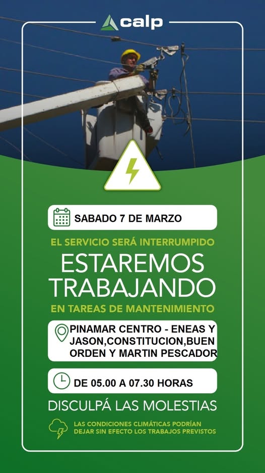 CALP COMUNICA Personal de Redes Eléctricas llevará a cabo distintas tareas este SABADO 7 DE MARZO, que afectará a Pinamar desde el Centro de Distribución 1 (Eneas y Jasón), Av. Constitución hacia la playa, Del Buen Orden hasta Martín Pescador, y zona de influencia. El motivo es la colocación de dos postes de cemento de media tensión en Av. Constitución entre Av. Shaw y Eneas, y poda general en toda la línea. Por tal motivo el servicio eléctrico estará suspendido en el horario de 05.00 a 07.30 horas. Disculpá las demoras. CALP - SUMEMOS ENERGIA